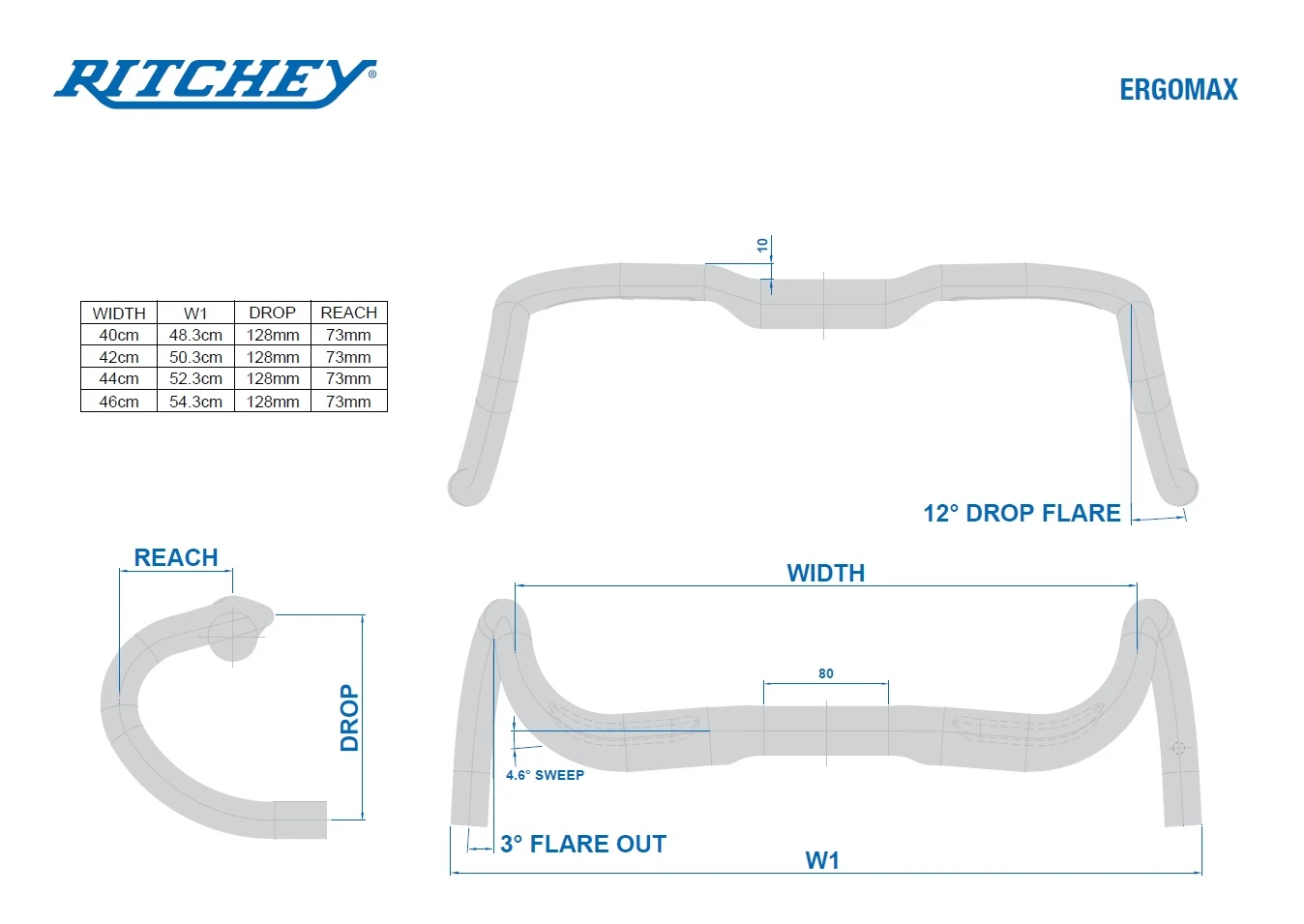Der ErgoMax wurde entwickelt, um die Kontrolle und den Komfort beim Fahren auf losem Untergrund zu verbessern. Er ist ideal für ein Gravel-Bike, da er die Hände in eine breitere, stabilere Position bringt, während sie sich in den Drops befinden. Der ErgoMax eignet sich ebenso perfekt für Rennräder, die auf Ausdauer ausgelegt sind, da seine Ergonomie einen unvergleichlichen Komfort bietet. Der Oberlenker ist im Klemmbereich um 10 mm erhöht, was eine etwas aufrechtere Fahrposition ermöglicht. Der Oberlenker ist ovalisiert und hat einen leichten Sweep von 4° nach hinten, um das Gewicht der Hände und Handgelenke des Fahrers gleichmässiger zu verteilen und sie in eine natürlichere Position zu bringen. Mit Blick auf die Ergonomie verfügt der ErgoMax außerdem über einen 12°-Flare, der die Hände des Fahrers in einer komfortablen und sicheren Position hält und gleichzeitig für etwas mehr Stabilität beim Kurvenfahren oder Sprinten sorgt. Der neue Ritchey ErgoMax Lenker bietet mehr Kontrolle, willkommenen Komfort und mehr Selbstvertrauen, wenn man auf Schotter fährt, sich auf mehrtägige Abenteuer begibt oder die langen Asphaltkilometer abspult.